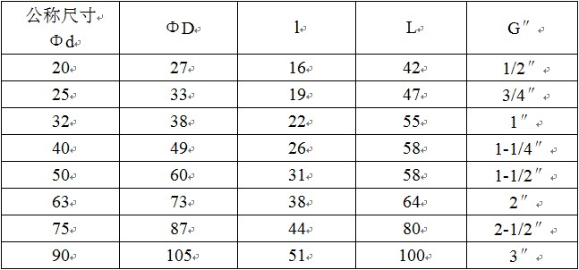 其中“G″”表示管件丝口直径,“L”管件长度,“l”表示承插口长度,“Φd”表示管件公称内径,“ΦD”管件公称外径,1.0MPa=10公斤
